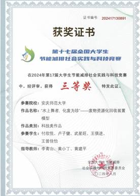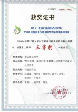 八月,第十七届全国老员工节能减排社会实践与科技竞赛决赛在中国石油大学(华东)圆满落幕。公司赵良波团队作品《“虻转乾坤,藻绿之源”畜禽粪污绿色高效资源化处理装置》(指导教师:李青山、刘凤霞、陈诚)和付欣悦团队作品《“水上舞者,化废为珍”——废物资源化回收装置模型》(指导教师:李青山、黄小丁、黄建平)荣获全国三等奖。