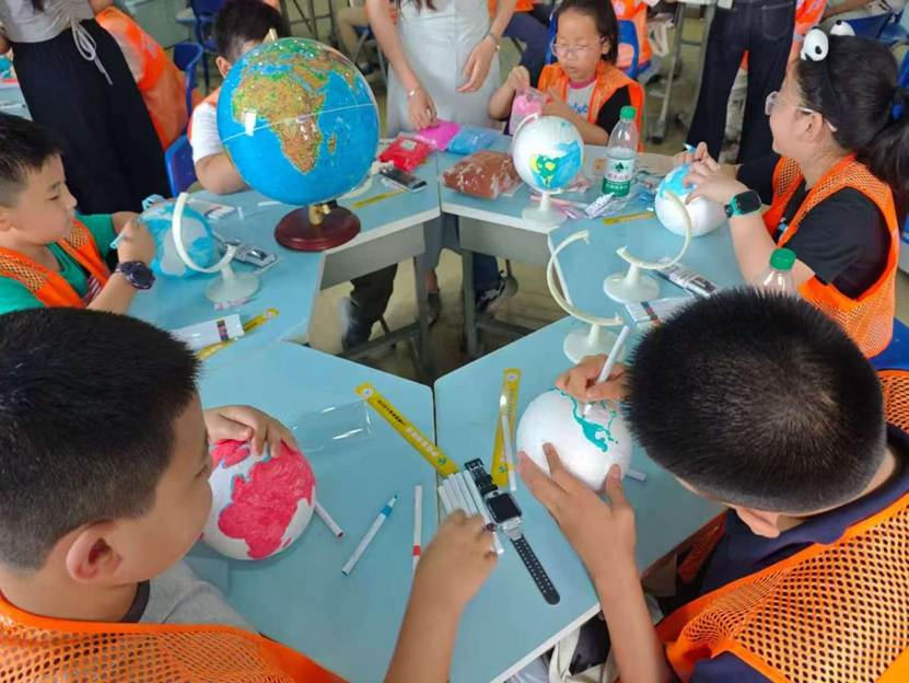 返回实验室后,学员们分组进行了地球仪模型制作与等高线地形图绘制。在地理师范生沈雯、王琦等的指导下,学员们利用泡沫球、颜料、支架等材料,将七大洲四大洋的轮廓和起伏的山体地形展现在地球仪上,把抽象的地理知识转化为触手可及的立体模型,极大地锻炼了空间思维能力。