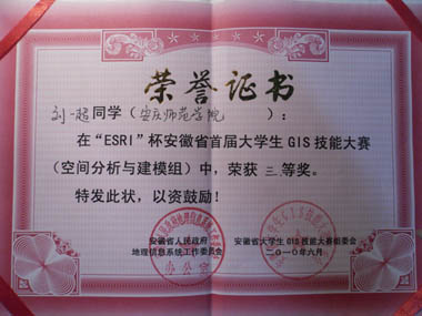 本次大赛分四个专业组比赛,来自合肥工业大学、安徽大学、安徽理工大学、安徽师范大学在内的12所本科高校共300多名员工参加了这次比赛。地理科学系组织两队员工分别参加了ENVI/IDL开发专业组、空间分析建模组和GIS软件操作专业组比赛,取得ENVI/IDL开发专业组总成绩第二,在一等奖空缺情况下,获得惟一的三等奖;空间分析建模组以预赛第二的优异成绩进入决赛,最终获得第三名;GIS软件操作组也在准备充分的情况下,通过团队合作获取第三名;整个赛事可谓是遍地开花,成绩斐然。同时公司还获得大赛优秀组织奖和优秀指导教师奖。此次参赛选手是地理科学专业2007级一班的黄巢亚、刘一超、韩婷、杨平、高磊同学,参赛组织活动负责人是周葆华经理,指导老师是金宝石、朱超平、余瑞林三位老师。