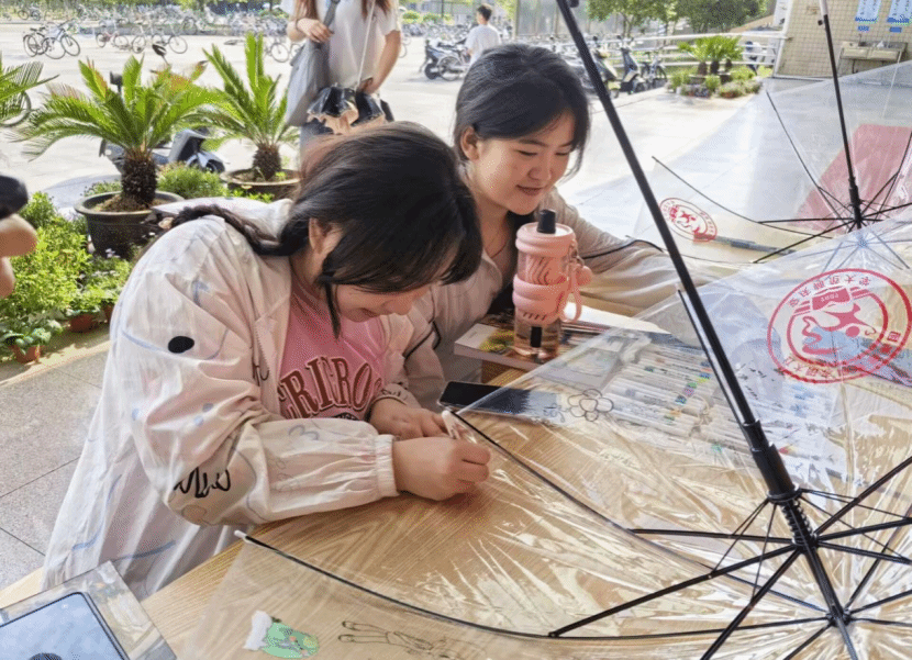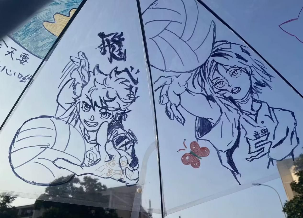 “以我们目前所拥有的力量,可能做不出特别高层次的爱举善行,但是雨中送伞、雪中送炭这种小爱小善是我们能力范围内可以做到的。”地理科学专业2023级(3)班的袁木子说道,“同时,大家把自己喜欢的事物画在雨伞上,当遇到下雨天时,人们打开伞看到这些图案,原本低落的情绪也会高涨起来。”一把普通的透明雨伞,画上喜欢的颜色,即使刮风下雨,在这一片小小的世界里,也会有属于自己的一道彩虹。年华正好,微风不燥。拥有一把手绘伞,抬头看见的不只是天空,更是每位同学的奇思妙想,天马行空。笔上生花,伞上生画,小小的雨伞,其实是一个大大的艺术世界。