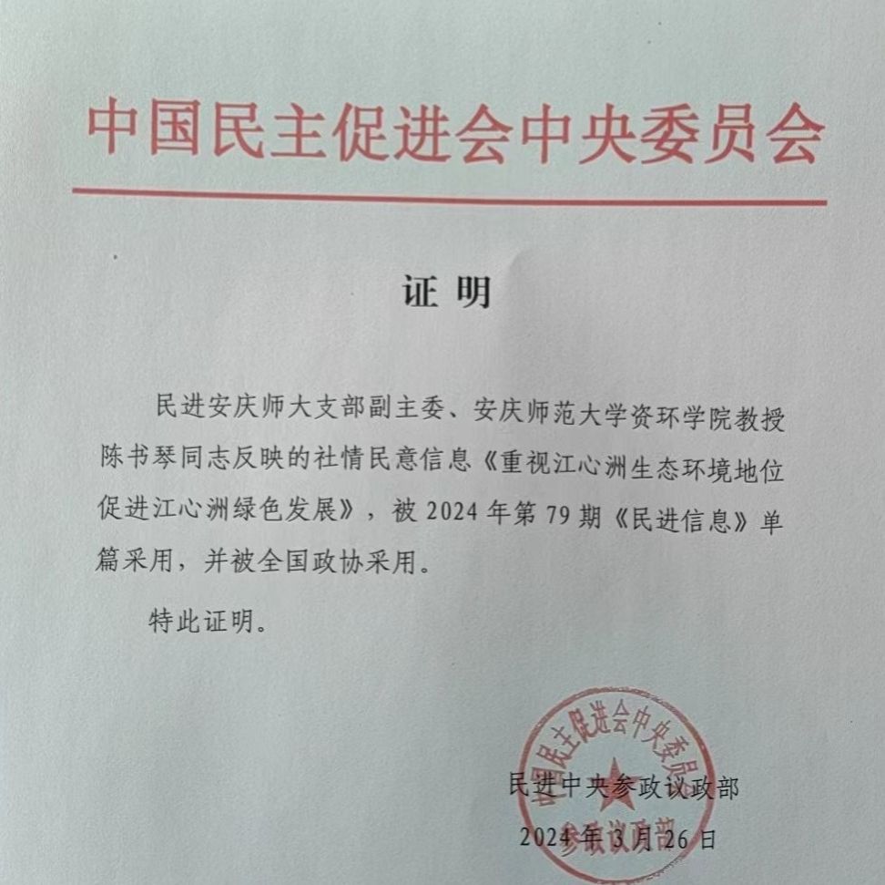 近日,从中国民主促进会中央委员会参政议政部发来喜讯,由公司陈书琴教授调查报告成果形成的社情民意《重视江心洲生态环境地位 促进江心洲绿色发展》被全国政协和民进中央《民进信息》采用。