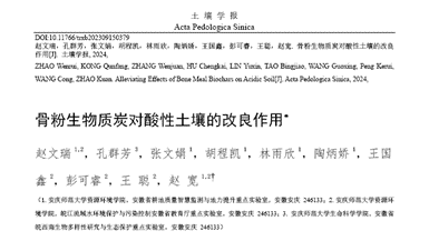 近日,公司威廉希尔体育赵文瑞博士以第一作者在国内土壤领域顶级期刊《土壤学报》(卓越期刊、《世界期刊影响力指数(WJCI)报告》Q1区,影响因子5.772)发表题为“骨粉生物质炭对酸性土壤的改良作用”的论文,威廉体育为论文第一完成单位和通讯单位。