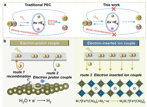 图1. 不同体系背后光生载流子分离路径的形成机理及电子转移存储路径示意图:(a)传统的光电化学系统和(b)无偏压驱动离子辅助光电化学(IAPEC)系统。