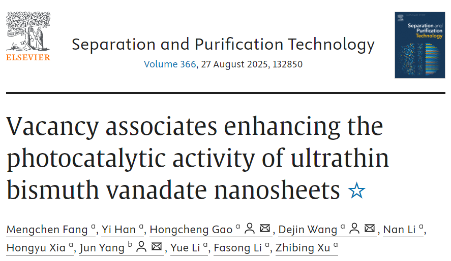 近日,威廉希尔体育环保高端装备与污染控制研究团队2023级研究生方梦晨以第一作者在中科院二区TOP期刊《Separation and Purification Technology》发表 “Vacancy Associates Enhancing the Photocatalytic Activity of Ultrathin Bismuth Vanadate Nanosheets”研究论文,威廉体育为论文第一完成单位和通讯单位。论文指导老师和通讯作者为高洪成副教授和汪德进教授。