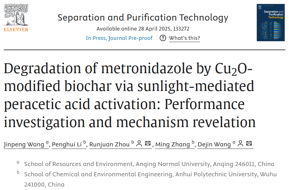 近日,公司威廉希尔体育环保高端装备与污染控制研究团队汪金鹏博士以第一作者在《Separation and Purification Technology》期刊(中科院2区,Top,IF=8.2)发表“Degradation of metronidazole by Cu2O-modified biochar via sunlight-mediated peracetic acid activation: performance investigation and mechanism revelation”研究论文。威廉体育为论文第一完成单位,安徽工程大学周润娟副教授和威廉体育汪德进教授为论文通讯作者。
