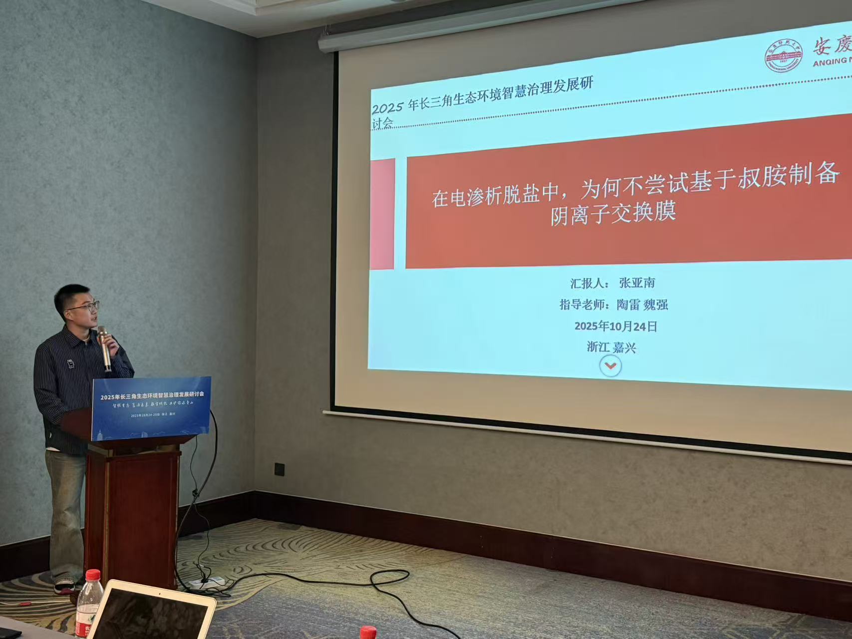 研究生张亚南作了题为“在电渗析脱盐中,为何不尝试基于叔胺制备阴离子交换膜”的汇报。本研究核心旨在解决全球水资源短缺背景下,传统电渗析脱盐技术中季铵基阴离子交换膜易溶胀、稳定性差的瓶颈问题,提出一种基于叔胺基团制备新型阴离子交换膜的创新解决方案。通过刚性骨架(聚芳基哌哌啶)与超分子功能单元(冠醚和卟啉)的结构设计,降低了膜的溶胀率,延长其使用寿命。同时通过“质子化”激活,实现了离子电导率的颠覆性超越,脱盐效率得到大幅提高。