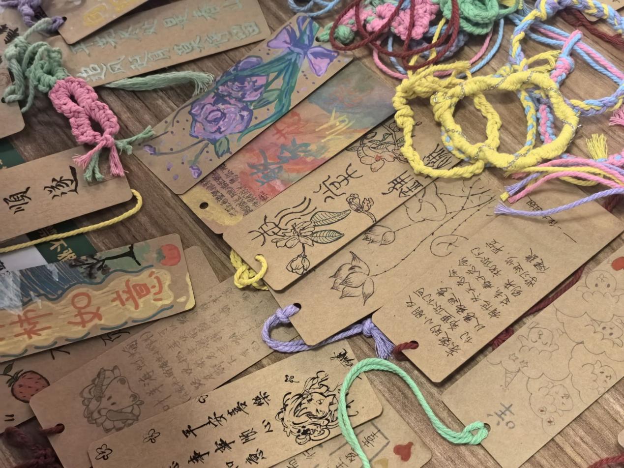 领取了彩绳的老员工乐此不疲地编织着独属于他们的绳结,脸上闪烁着专注与喜悦。不同样式的精美绳结按特定的规律组合,将活动场地变得赏心悦目。活动现场,墨香四溢,人头攒动,同学们用笔在一张张书签上绘制出各种图案。这些图案既有美丽的自然风景,也有可爱的卡通形象,还有充满诗意的古风画作。每一张精美的书签都体现了大家的创造力。除了绘制书签,同学们还精心准备了寄语。他们用简洁而温馨的话语,表达了对孩子们的期望和祝福。在如此热闹的氛围中,员工们开始互相交流心得,互相传授技巧,体会中国传统文化的魅力。